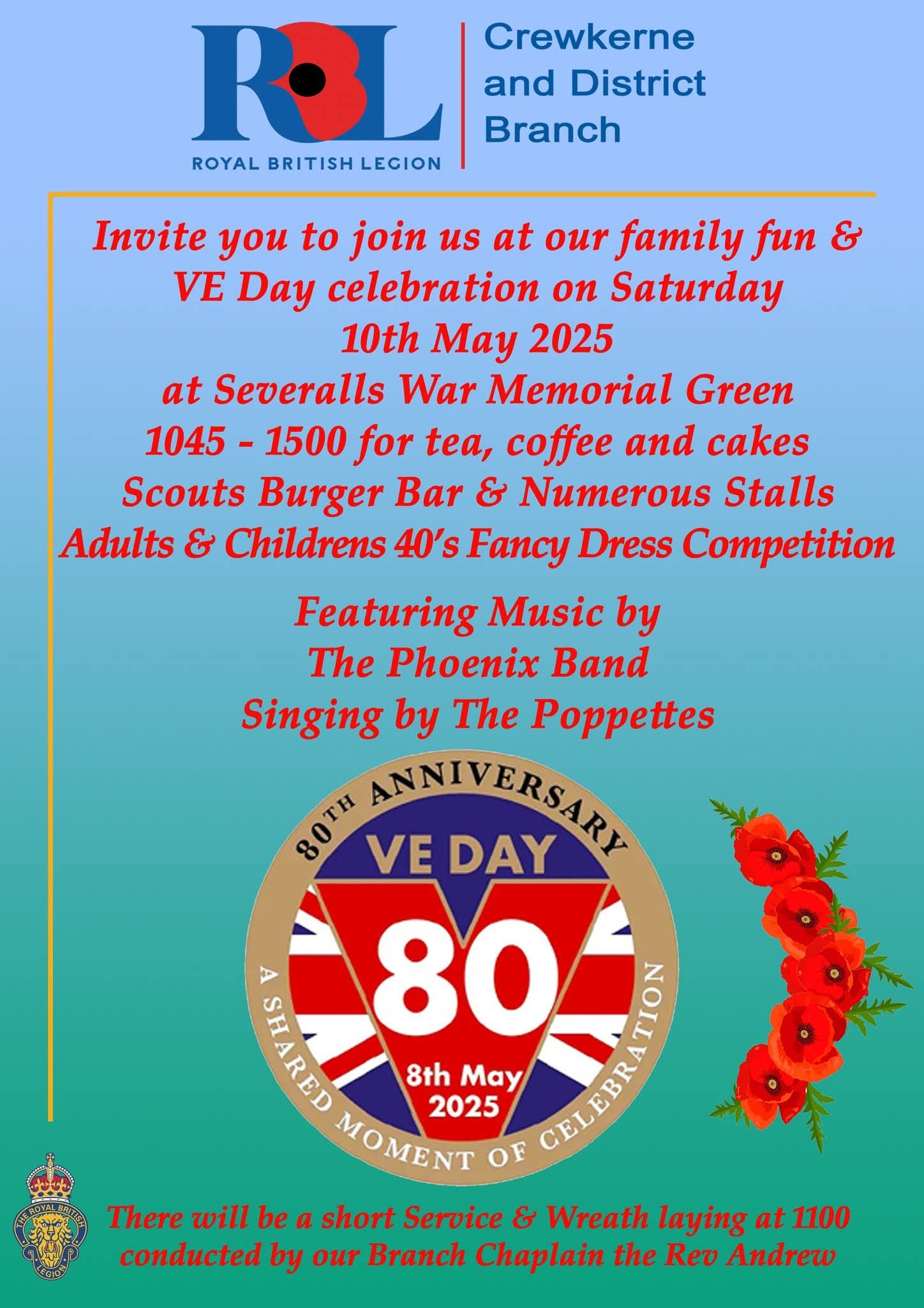 The Royal British Legion Crewkerne Branch is set to host a day of family-friendly festivities on Saturday, 10th May 2025, to commemorate the 80th anniversary of VE Day. The event will take place at Severalls War Memorial Green from 10.45am to 3.00pm.